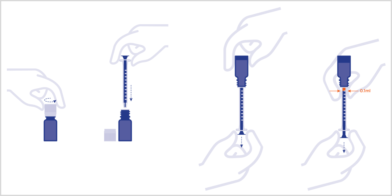- 2Vend flasken på hovedet for at fylde sprøjten. Mens du holder sprøjten på plads, trækker du forsigtigt stemplet ned og trækker væsken op til den korrekte dosis i sprøjten.